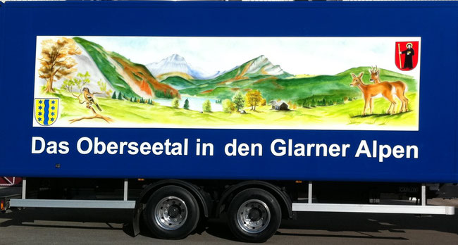Beim Vorbeifahren entdeckte ich das Gemälde "Das Oberseetal in den Glarner Alpen". Der Besitzer und Initiant für diese originelle Idee ist der Näfelser Fahr-Lehrer Josef Landolt, der mit dieser rollenden Werbewand weit herumkommt. Er müsste für diese touristisch interessante Idee augezeichnet werden. Als ich ihn bei einer Begegnung darauf ansprach und bat, mich mit diesem Bild für meine