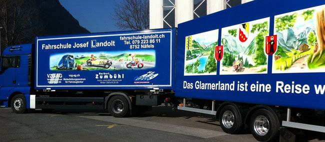 Die Gegenseite des LKWs und Anhängers. Links Eigenwerbung für die Fahrschule, rechts Werbung für die drei Gemeinden Glarus Nord (links), Glarus (Mitte) und Glarus Süd (rechts, leicht angeschnitten).