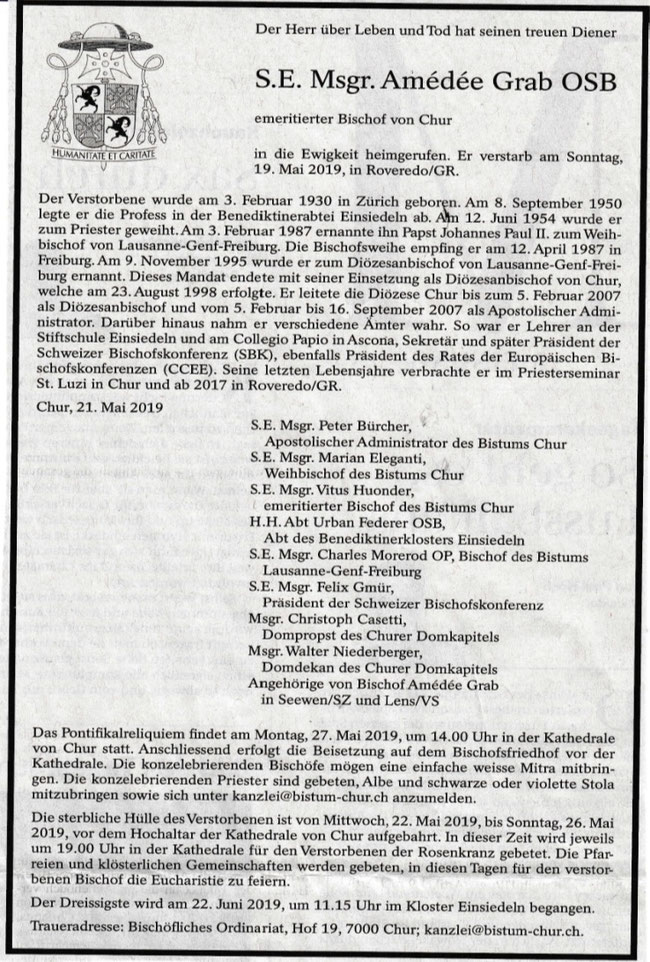 Bischof von St. Gallen tritt ins Kloster Näfels ein.