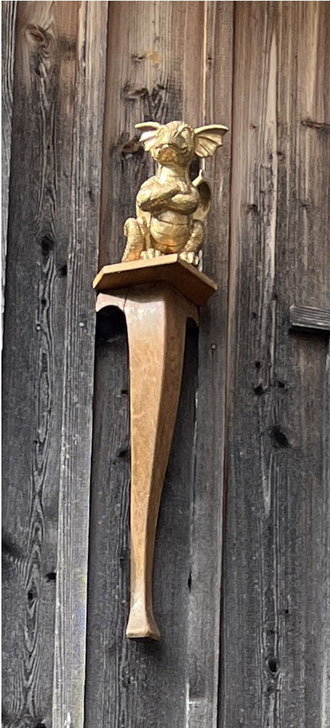 Seit heute Mittwoch Nachmttag hat der "Gärbihund" einen Ehrenplatz in der Gerbi, an der Gadenfront (siehe Bild). Gerbihund-Mitträger Franz Schmidig (die vier verdienstvollen Gerbihundträger siehe Bild unten haben während 30 Jahren, jeweils am letzten Samstag der Sommerferien im August, ein rauschendes Ger-bifest auf dem Marzällenplatz organisiert und gestaltet. Nun hat der findige Fanz Schmidig, weltweit gereister Orgelbauer aus einem Stuhlbein eine Prachtssockel hergestellt und auf ihm den 16. Gerbihhund platziert. Nun prangt der sagenhafte