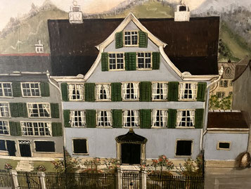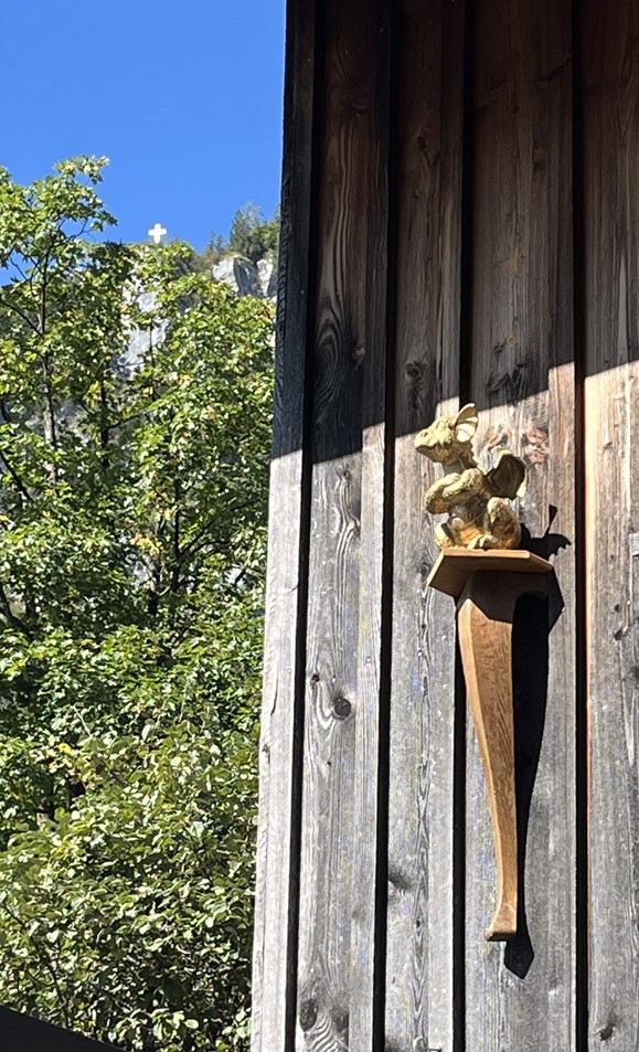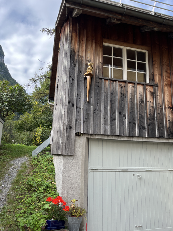 "Gärbihund" an der Gadenfront mit Blick nach Süden (nach Rom) einen würdigen Platz gefunden. Sehr wahrscheinlich wird er in die Liste der schützenswerten Denkmäler des Katons Glarus aufgenommen und Unter Heimatschutz gestellt. Franz Schmidigs Gattin Catherine hat in verdankenswerter Weise als Blu-menschmuck am Fussende der Gadenfront, beim Ausgang zum Rautiport einen herrlich blühenden Geranienstock angebracht.