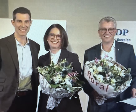 Keep smiling - Sie strahlen um die Wette: Der scheidende FDP-Schweiz-Präsi-dent Ständerat Thierry Burkart und Nationalrätin Susanne Vinzenz-Stauffacher, ehem. Präsidentin FDP Frauen Schweiz und Ständerat Benjamin Mühlemann, ehem. Regierungsrat und Landammann des Kts. Glarus. Sie sind heute um 14.48 Uhr glänzend gewählt.