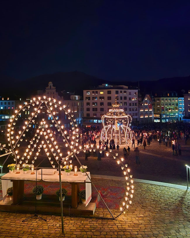 Im Vordergrund ein speziell aufgestellter Altar, weiter unten der Marienbrunnen lichtergeschmückt, im Hintergrund Hotels- und Geschäftshäuser-Fensterfronten mit Kerzen geschmückt,.