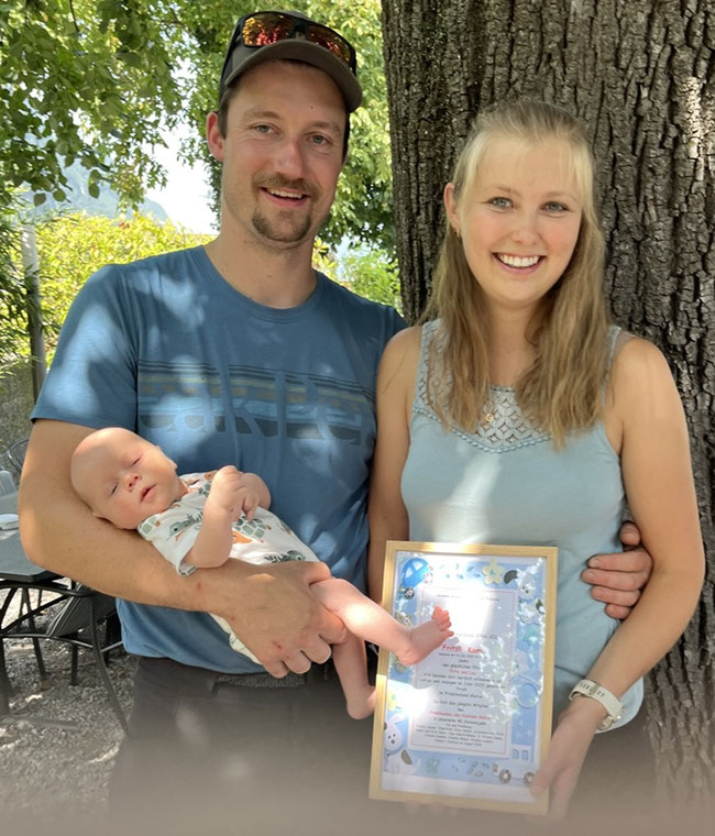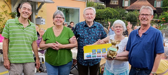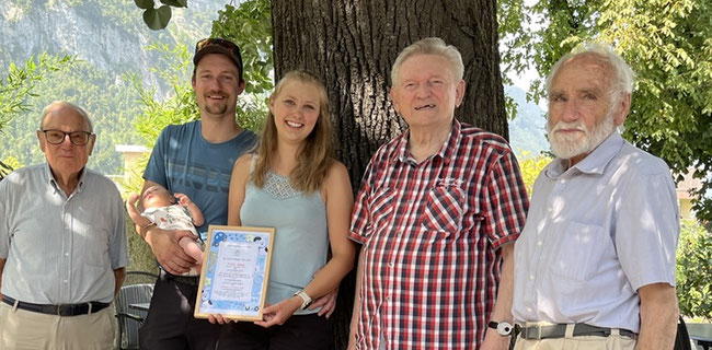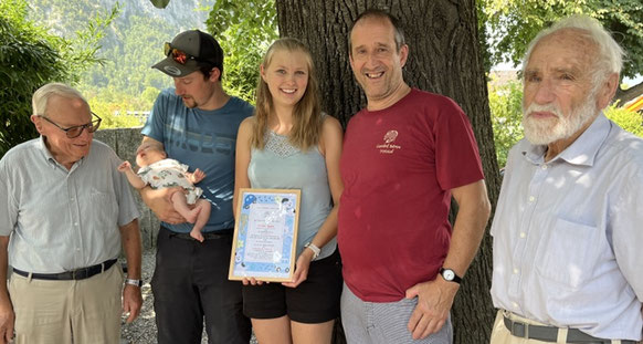 Preisübergabe vlnr Foti Fränzel hält den vom Bezirskammann überreich-ten Check von Fr. 5'000.-, Franz jun. nimmt die Preisurkunde aus den Händen von Bezirksrätin Leta Bolli entgegen, BA Egli ist dabei die Blumensträusse nachzureichen.