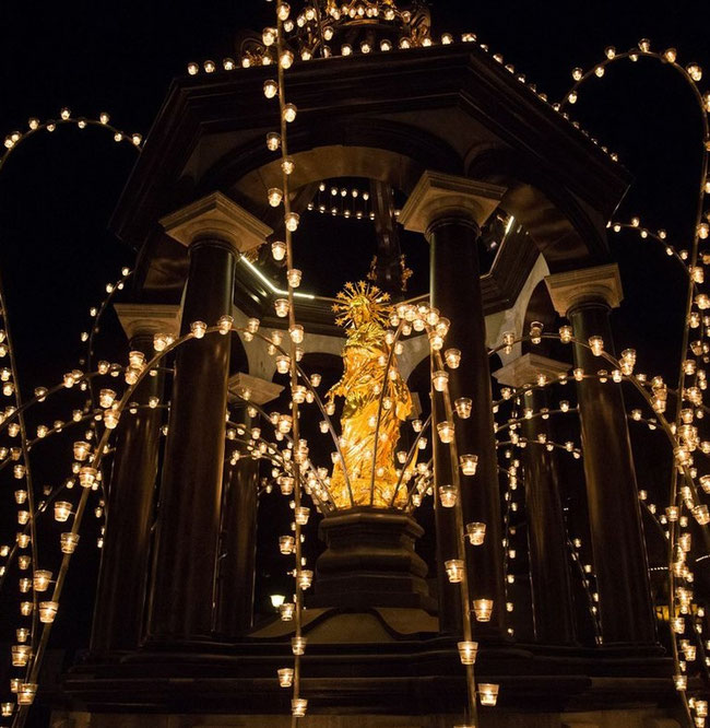 Erleuchtete Marienstatue auf dem Marienbrunnen und ungezählte Kerzen