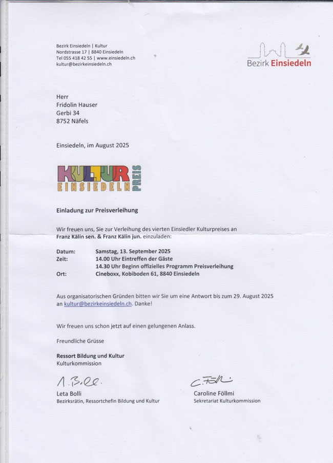 Einladung zur Preisverleihung durch die Kulturkommission des Bezirks Einsiedeln