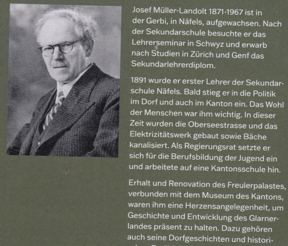 Das Buch ist ein ehrendes Andenken an Josef Landolt-Müller, der als erster Sekundarlehrer und langjähriger Gemeindepräsident und Stiftungsratspräsi-dent des Freulerpalastes in Näfels, später als Regierungsrat und Landam-mann im Kanton wirkte.