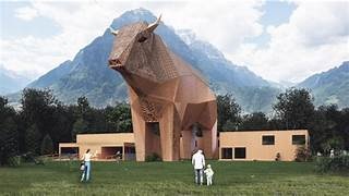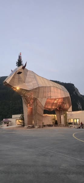 Die Einzelteile werden dezentral in verschiedenen Betrieben aus Schweizer Holz produziert und die Elemente in Verbindung mit einem Lehrlingscamp in Mollis vor Ort zusammengebaut. Der obere Teil des Holz-Muni wird mit Brettschindeln gedeckt, und die Wandelemente werden offen gestaltet. Für das stabile Tragwerk sind Stützen und Fachwerke in Rumpf und Beinen integriert.