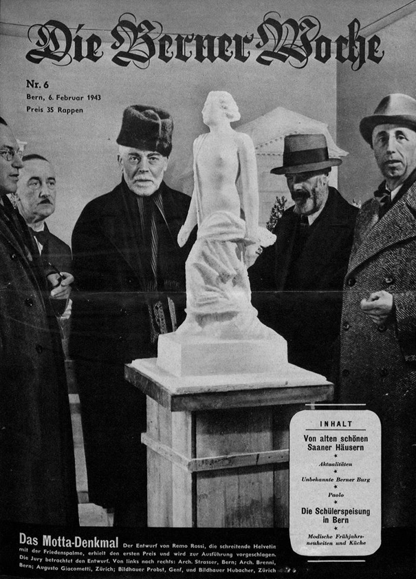 Der Entwurf von Remo Rossi, die schreitende Helvetia mit der Friedens-palme, erhielt den ersten Preis und wird zur Ausführung vorgeschlagen. Die Jury betrachtet den Entwurf. Von links nach rechts: Arch. Strasser, Bern; Arch. Brenni, Bern; Augusto Giacometti, Zürich; Bildhauer Probst, Genf; Bildhauer Hubacher, Zürich.